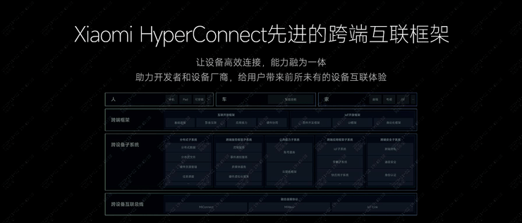 最上层 HyperConnect 跨端层,小米澎湃OS则是彻底打破了硬件设备的隔阂,让所有设备可以统一连接协议,并且实时通信。让整个小米澎湃OS生态打通“任督二脉”,每个设备如同感知世界的触角,像一张巨大的网一样连接一起,最终构建「人车家全生态」的智能世界。