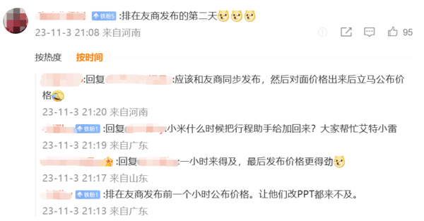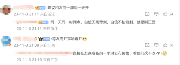 有网友表示,Redmi K70的发布会最好安排在友商发布后的第二天,这样它们就没法根据Redmi来进行定价。更有网友表示,就应该跟友商选择同一时间发布,并且最好同时公布价格,这样友商就没法连夜改PPT了。