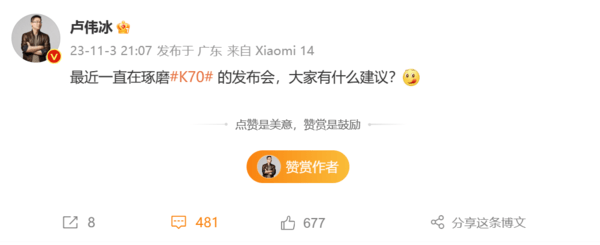 【手机中国新闻】在小米14系列发布之后,小米集团的下一款明星机型无疑就是定价更亲民的Redmi K70系列了。11月3日晚,小米集团合伙人、总裁,国际部总裁,Redmi品牌总经理卢伟冰在微博发文,向网友征集有关Redmi K70发布会的建议。