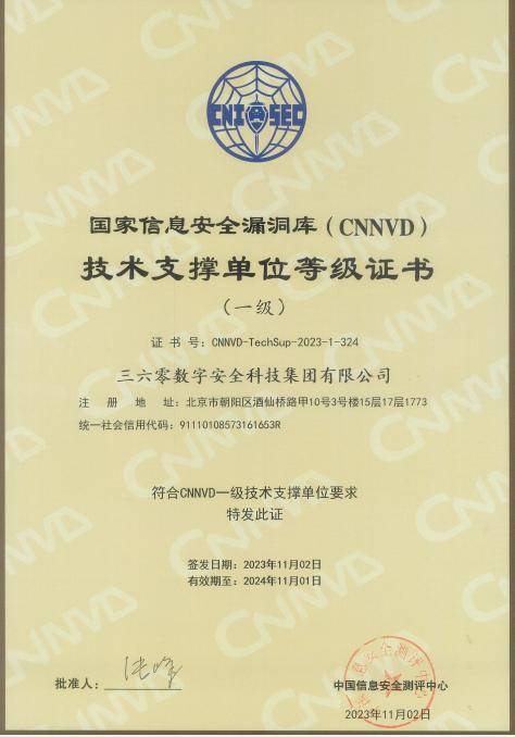 近日,360数字安全集团荣获中国信息安全测评中心颁发的“国家信息安全漏洞库(CNNVD)一级技术支撑单位等级证书”,成为该领域最高级别支撑单位之一。