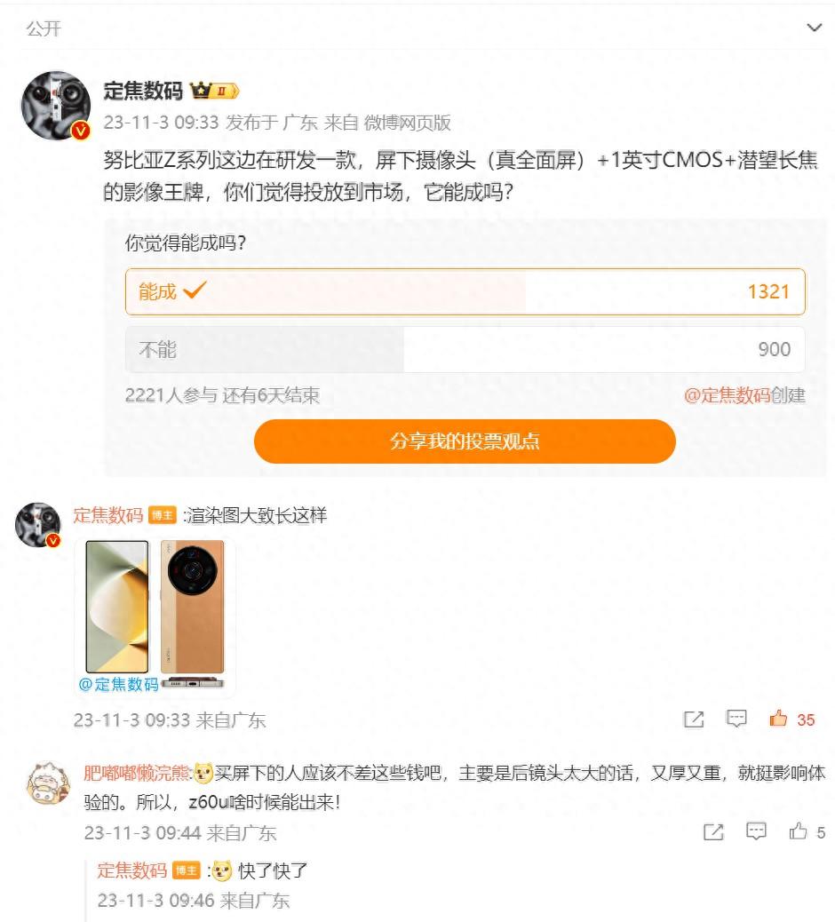 近日,知名数码博主定焦数码在微博发布了努比亚Z系列正在研发一款屏下摄像头(真全 屏)+1英寸CMOS+潜望长焦的影像王牌,引发了网友的热议和投票,根据投票信息,多数网友认为这款新机应该成了。