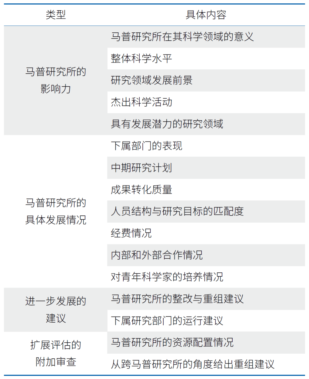 扩展评估环节大约每6年开展1次。开展扩展评估是为了满足马普学会的战略规划需要,从跨马普研究所的视角来探究基础研究领域的前景,目标是识别研究机构之间可能的协同作用,发现共同问题或避免重复研究。评估内容主要分为取得的科学成就、资源配置情况与马普研究所的中期前景3项。