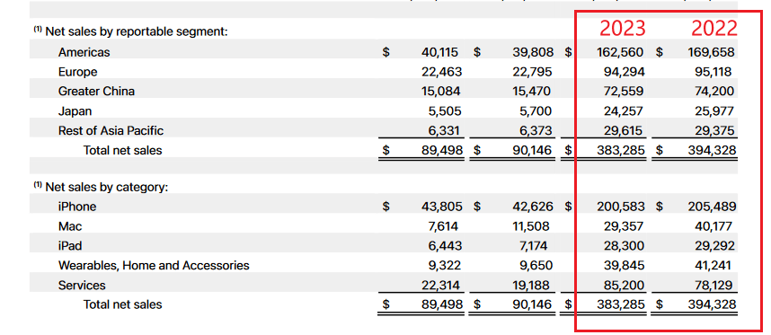 而除了 iPhone 以及 Mac,iPad 业务财年收入也小幅微跌至 283 亿美元,可穿戴、家庭及配件业务收入则跌破 400 亿美元,跌幅约 3.3%。