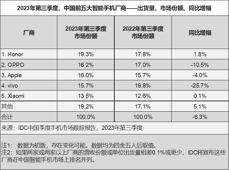 而另外一份则指出,同期第三季度中国智能手机市场出货量约 6705 万台,继续同比下滑 6.3%。其中苹果以 16%的市场份额位居第三,同比降幅达 4.0%,好于 OPPO 与 vivo,差于荣耀和小米。
