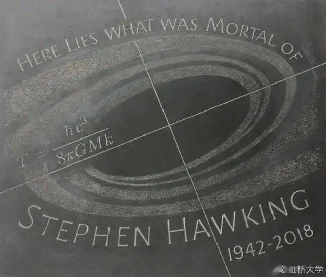霍金的墓碑。雕刻的图案示意气体云正被黑洞缓缓吞噬,左边的公式是霍金辐射的主要体现。
