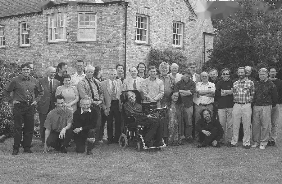 2001年8月,马丁·里斯(站在史蒂芬左边)在他位于英国剑桥的农舍里召开了一次会议,讨论人择原理在基础物理学和宇宙学中可能有的价值。正是在这次会议的间隙,史蒂芬和托马斯·赫托格(第三排,史蒂芬后面)开始认真讨论如何用量子宇宙观取代宇宙学中的人择观点