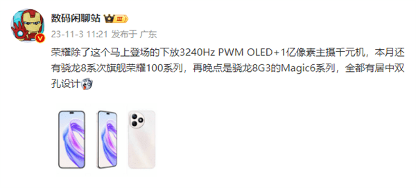 日前,数码博主 @数码闲聊站 爆料称,“荣耀除了这个马上登场的下放3240Hz PWM OLED+1亿像素主摄千元机,本月还有骁龙8系次旗舰荣耀100系列,再晚点是骁龙8G3的Magic6系列,全都有居中双孔设计”。根据目前官宣的信息来看,其爆料的这款千元机应该就是已经官宣将于下周五发布的荣耀X50i+。
