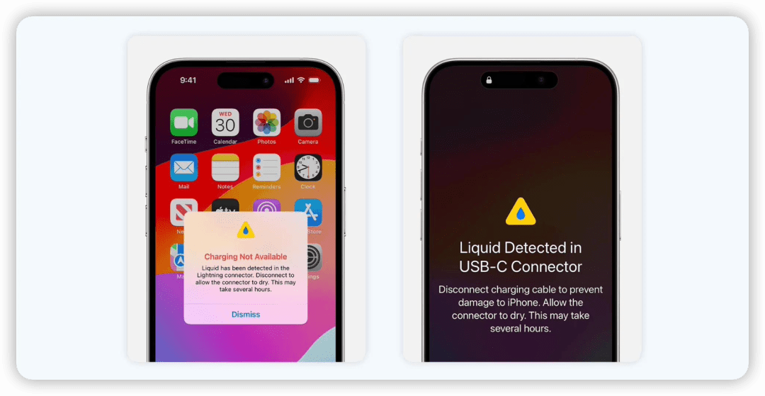 苹果在 iPhone 和 iPad 上已经装备了类似的守护程序,用于在连接器中检测到液体时提醒用户,以便用户立即拔下充电电缆,防止进一步的损坏。