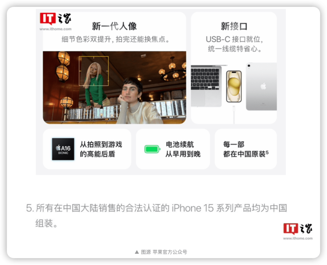苹果:所有在中国大陆合法销售的 iPhone 15 /Pro 系列手机均为中国组装