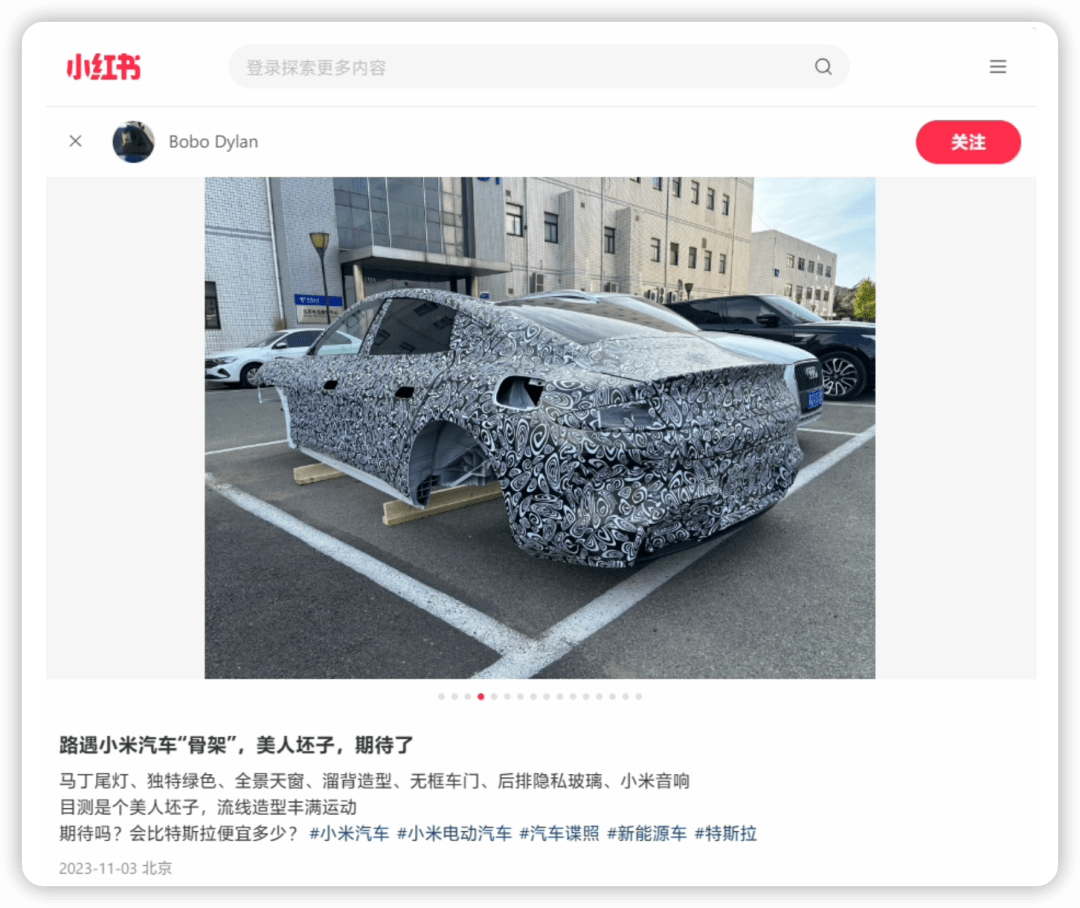 11 月 3 日消息,小红书博主 Bobo Dylan 今日下午发文称自己偶遇小米汽车的「骨架」(即白车身),并晒出了大量新车车架的实拍图。