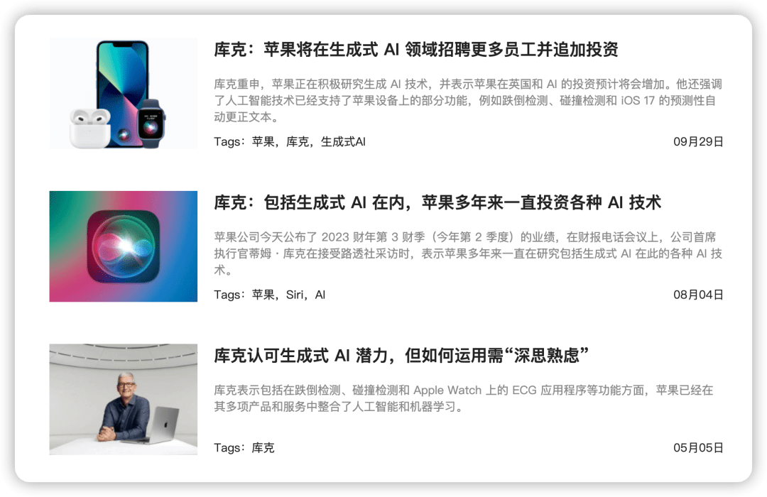 实际上,这也并非是库克首次在公开场合表达过对 AI 技术的认同,此前他也在多次采访中透露过苹果正在进行 AI 领域的开发。