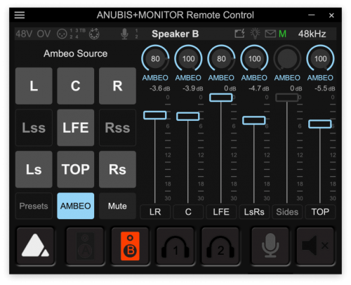 AMBEO双声道空间音频实时渲染器让所有观众都能领略环绕声和沉浸式内容的魅力。图中所示为用于微调空间增强型双声道混音的渲染器界面原型机,用户可通过标准Anubis远程遥控软件进行控制