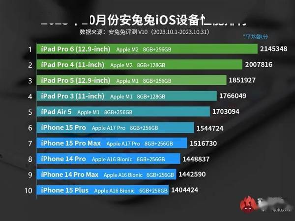 快科技11月4日消息,安兔兔公布了10月iOS设备性能榜。