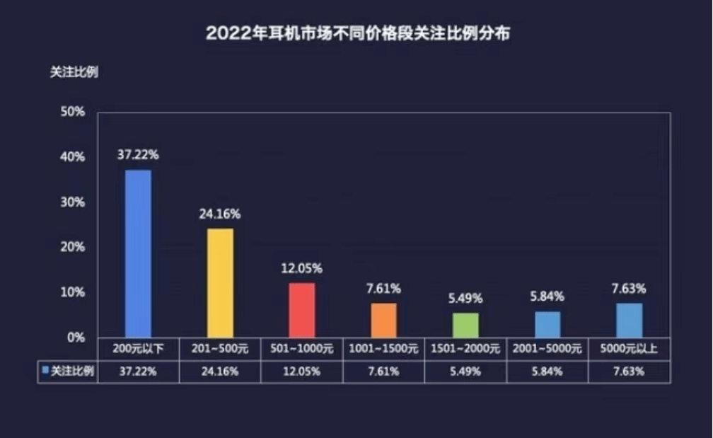 但是,在真无线耳机市场,大部分消费者关注的还是百元级的耳机。根据中关村在线公布的数据,2022年,耳机消费者中关注500元以下价位段的占比高达61.38%,而关注500元至2000元价位段的只有25.15%。