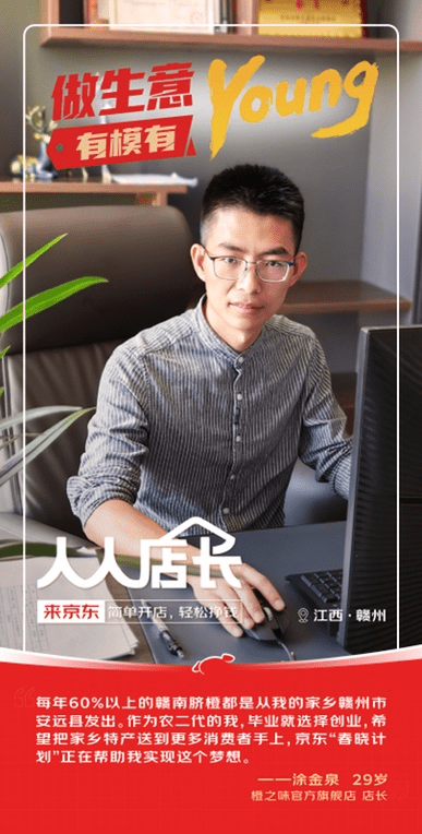 作为“农二代”的涂金泉,其家乡位于赣南脐橙核心产区——安远县,每年有60%以上的赣南脐橙从这里发出。大学攻读电子商务专业毕业后,涂金泉果断选择回乡创业卖水果,2020年5月在京东开设了属于自己的店铺,转型成为“商一代”。如今,涂金泉的公司不仅有占地2万余平方米的加工厂,也建立起了完善的运营团队,希望让全国的消费者都吃上性价比更高的赣南脐橙,也帮助当地果农增收致富。