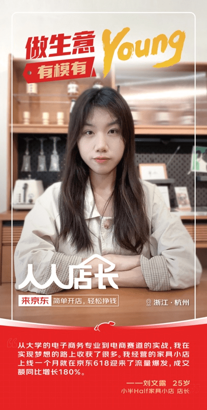 刘文露大学毕业后,在今年4月正式入职杭州的一家公司,为公司旗下“小半家具”品牌进行电商推广策划。“小半家具”深耕家具供应链多年,拥有从设计、打板、生产、销售、售后全链路“一条龙”自主化能力,这让刘文露看到了品牌巨大的发展潜力。今年5月,刘文露成为“小半家具”的京东店长,小店上线一个月就在京东618迎来流量爆发,6月成交额同比增长180%。