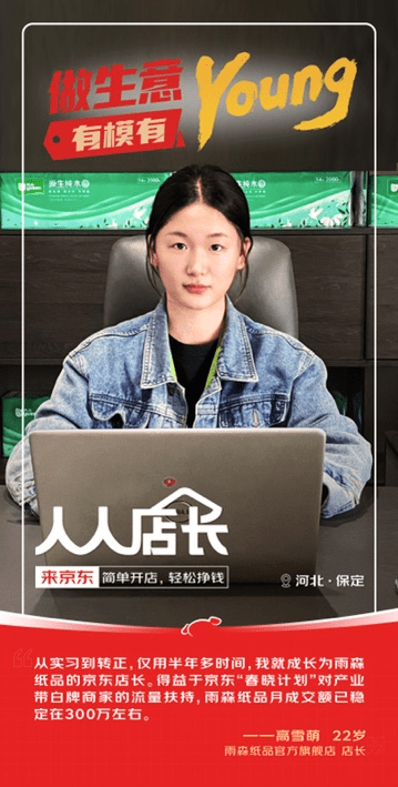 保定市被誉为“华北纸都”,保定雨森卫生用品有限公司作为当地经营生活用纸和卫生用品的头部企业,坐拥源头好货,全链条品质可控。作为00后的高雪萌,从2021年12月实习到次年6月转正,仅用半年多时间,就成长为雨森纸品的京东店长。