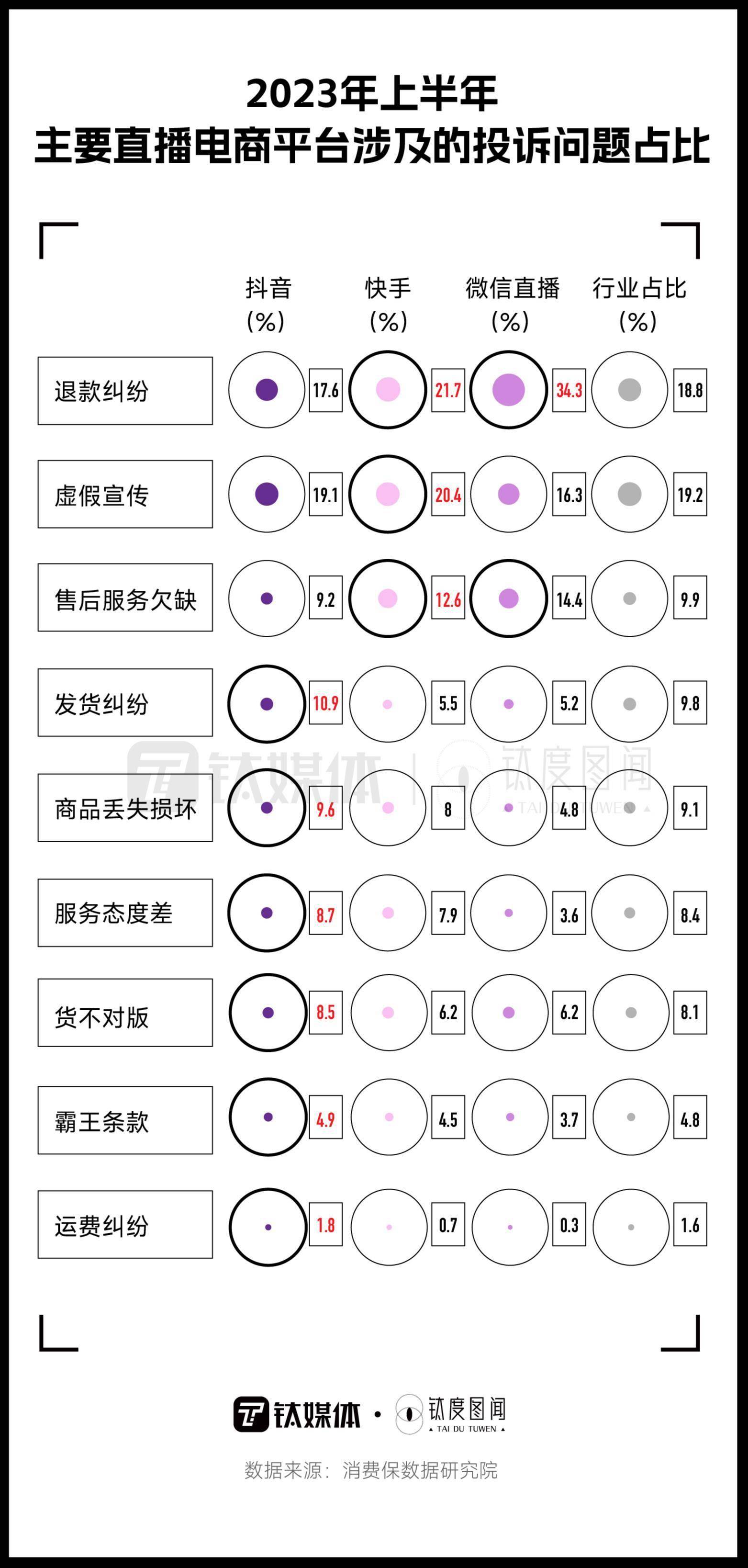 在抖音、快手、微信三个平台中,抖音平台的发货纠纷、商品丢失/损坏、服务态度差、货不对版、霸王条款及运费纠纷问题均略高于行业占比;快手的退款纠纷、虚假宣传、售后服务欠缺以及假冒/二手商品问题占比均高于行业水平;而微信直播的退款纠纷、售后服务欠缺问题较为突出。直播电商多种问题频发,导致消费者的购物体验大打折扣。