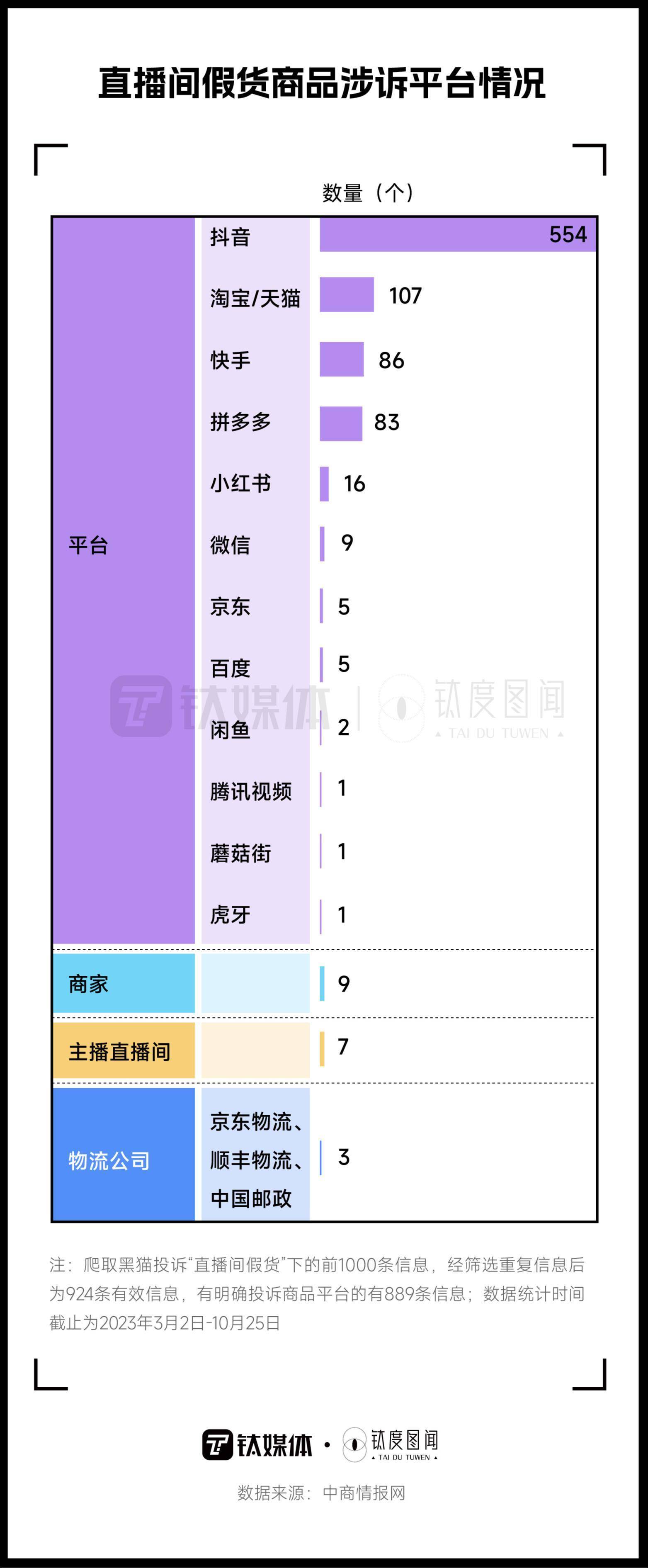 在钛媒体·钛度图闻统计的889条有效投诉商品平台数据显示,抖音成为直播假货遭投诉最多的平台,62.3%的假货商品与抖音有关。其次,淘宝/天猫和快手电商平台分别位列投诉平台的第二、三位。除了相关电商平台,一些商家、主播直播间和快递物流也是被投诉的对象,但投诉量比起平台少很多。直播间假货现象泛滥的原因之一就在于所处平台监管存在不健全和不到位的因素,让无良商家趁机钻了空子。