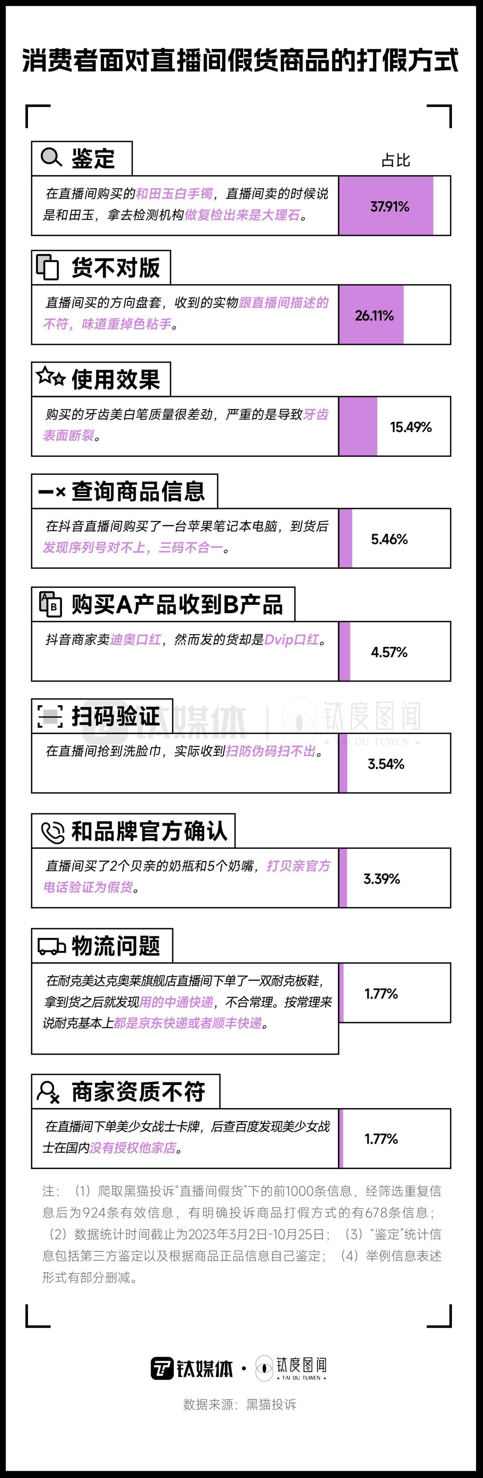 在面对直播带货频频“翻车”、粗制滥造的假货商品时,消费者也在用相关方式进行“打假”。据钛媒体·钛度图闻统计的678条“消费者面对直播间假货商品的打假方式”,鉴定是消费者使用最多的打假方式,占比达37.91%。鉴定方式包括相关机构、从业者的第三方鉴定和消费者自己根据相关信息进行真假商品鉴定。