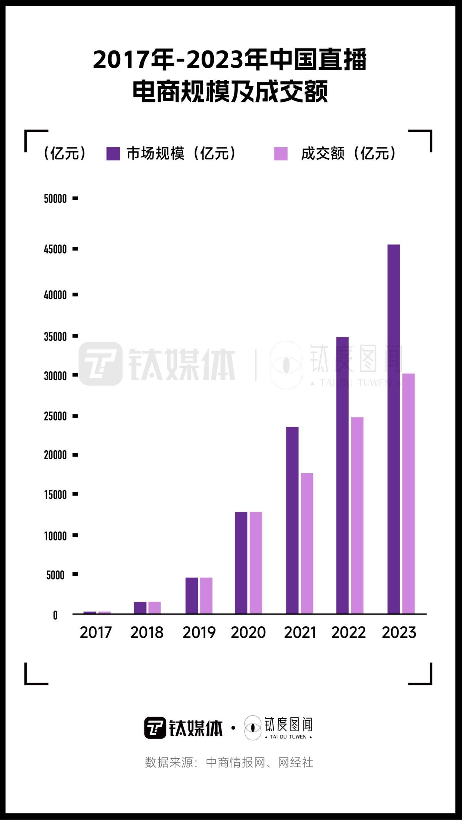 2023年上半年,直播电商交易规模约为19916亿元,预计全年规模达到45657亿元,同比增长30.44%,较2017年增长超232倍;直播电商成交额预计全年将达30159亿元,较2017年增长超112倍。