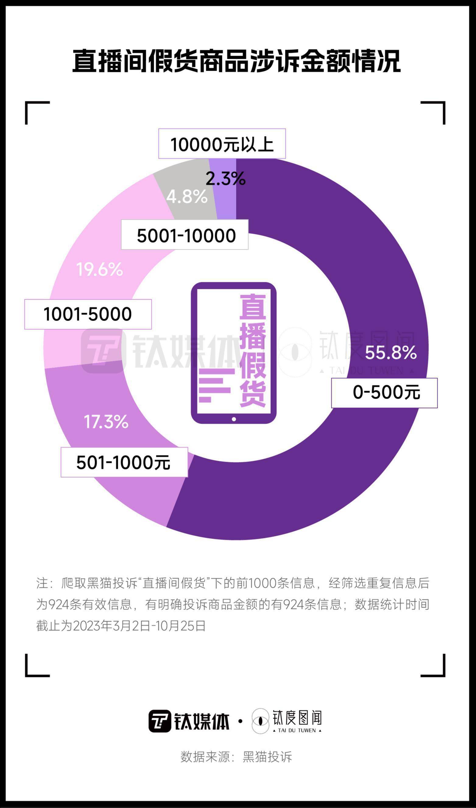 消费者在直播间一定听到过这样的话术:“我们是官方发货,保真保价,假一赔十”、“这个价格在其它直播间肯定是没有的”......商家嘴里低价保真,物美价廉的商品,真正做到了“价廉”。钛媒体·钛度图闻统计的924条投诉商品金额数据显示,500元以下的商品占比达一半以上为55.8%;投诉金额为1001-5000元的商品排名第二,占比近两成为19.6%。商品金额在10000元以上的数量很少,仅占2.3%,大多是奢侈品牌以及古玩珠宝类产品。
