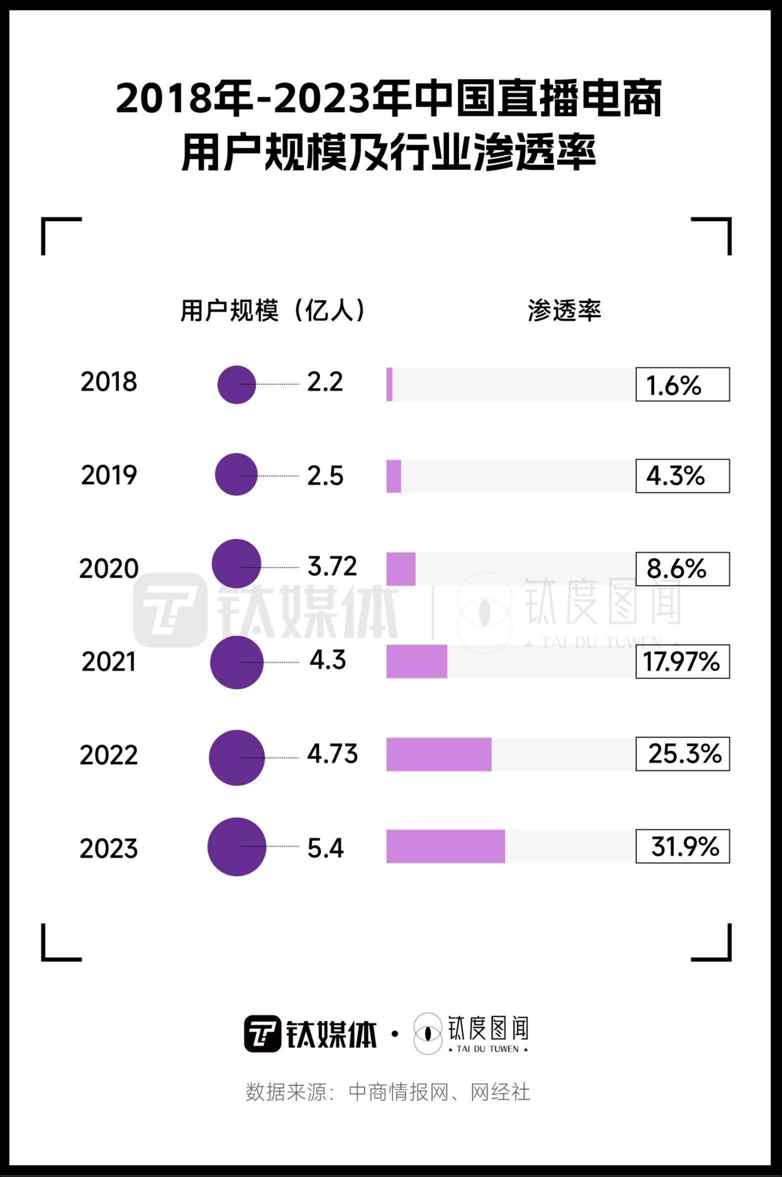 中国直播电商行业已经走过了初创期和快速发展期,直播电商行业渗透率逐步提升。2018年,直播电商行业渗透率为1.6%;2023年上半年,直播电商交易额渗透率约为27.8%,预计全年直播电商行业渗透率达到31.9%,比2018年上涨30个百分点。随着行业渗透率的稳步提升,直播电商获得越来越多用户的青睐,直播电商用户规模从2018年的2.2亿人上涨到2023年上半年的5.2亿人,预计2023年全年直播电商用户规模将达到5.4亿人,同比增长14.2%。