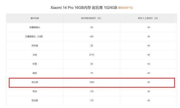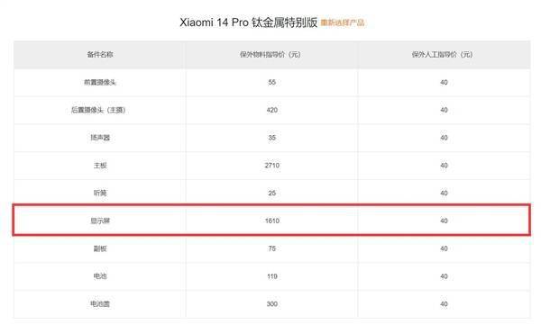 其次是显示屏,小米14 Pro钛金属特别版换屏是1610元,小米14 Pro换屏是1000元。