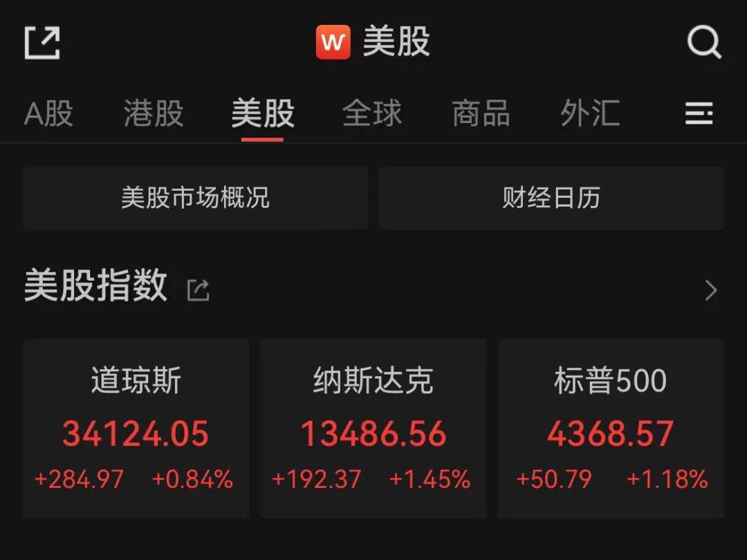 受此消息提振,美股高开,标普500指数和纳斯达克综合指数涨幅扩大到1%以上,分别涨1.18%和逾1.45%,道琼斯工业平均指数涨超284点、涨0.84%。