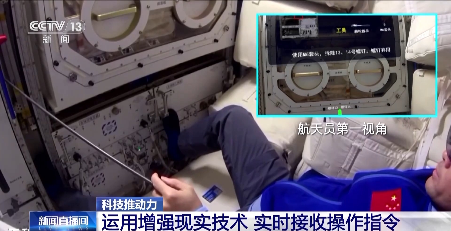 中国科学院空间应用工程与技术中心研究员 张璐:一步一步地引导航天员进行相应的操作。有的时候你可以想象,如果航天员一边看我们的平板电脑,一边去操作,他其实会非常影响我的这个操作的流畅性。那么当我戴着一个眼镜之后,那么我就不用频繁地去一会儿看我的手册,一会儿去做一个操作,他整个过程可以非常流畅地进行下去。