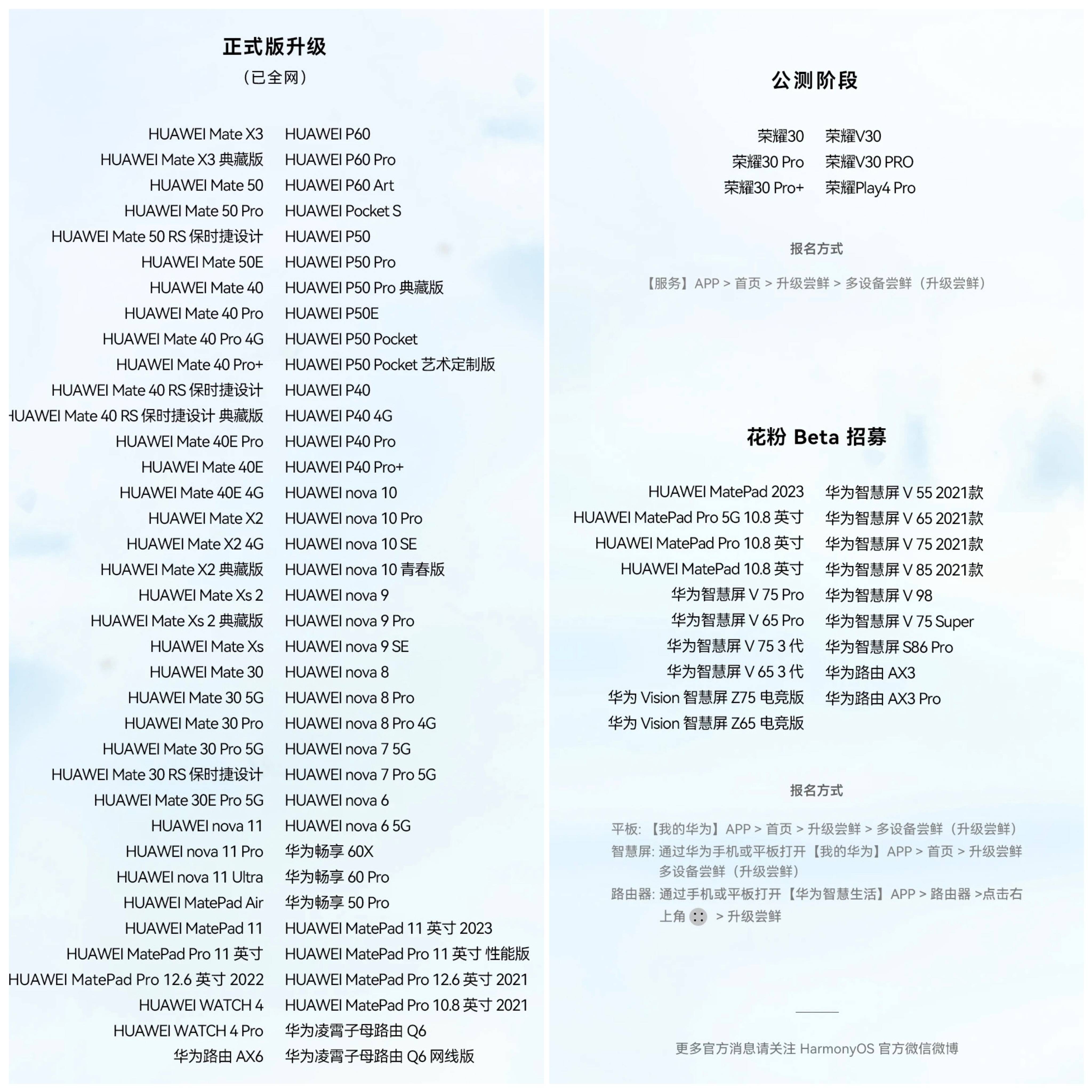 众所周知,备受瞩目的鸿蒙HarmonyOS 4.0系统已经在今年8月正式发布,以「放肆玩 一起玩」为主题,全新的鸿蒙4.0带来了「更个性、更高效、更智慧、更流畅、更安全」等系统特性,升级后将获得焕然一新的使用体验,因此相关的升级名单受到了众多用户的关注。这几个月下来,鸿蒙4.0已经推送支持近70款华为设备升级正式版,同时还支持6款荣耀老机型公测升级,如今官方再次公布了百机升级进展计划,接下来华为和荣耀更多的老机型也能升级使用鸿蒙4.0了,目前相关的名单已经公布。