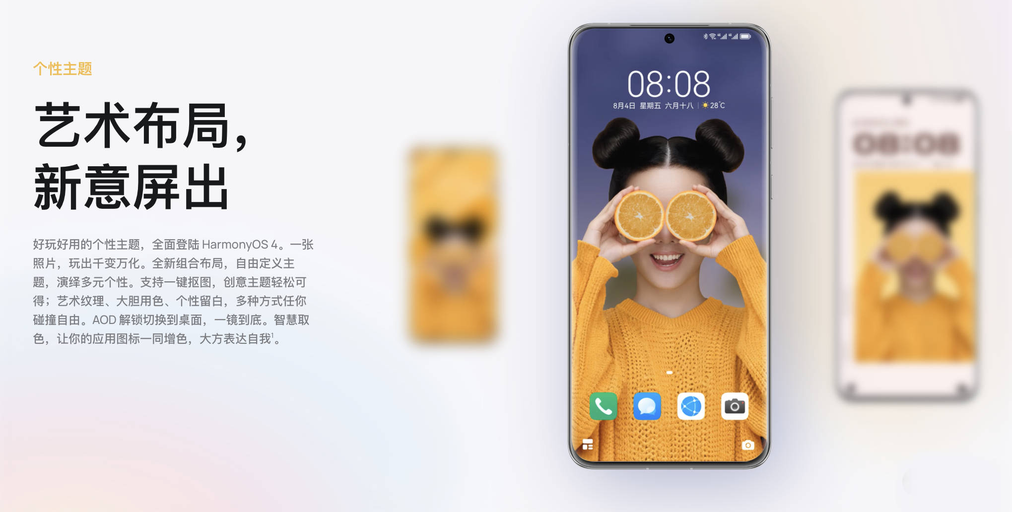 据悉,鸿蒙4.0带来了好玩好用的个性主题功能,一张照片可以玩出多种花样,支持一键抠图,结合艺术纹理、大胆用色、个性留白等多种创意主题,加上全新的组合布局、自由定义主题,用户将可以根据喜好创建个性化的主题布局。
