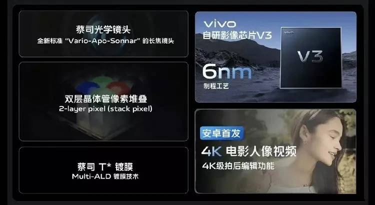 其实根据目前的爆料来看,影像方面应该是vivo X100系列的最大亮点,其后置5000万主摄(IMX920)+5000万超广角(三星JN1)+6400万潜望式长焦(OV64B)三摄组合,最高支持3X光学变焦功能。除此之外,vivo X100还有全新标准的APO潜望式长焦镜头,搭配Nice算法和蔡司移动影像,内置自研的V3影像芯片,采用最新的6纳米工艺制程,软硬结合才是影像的最终解决方案。