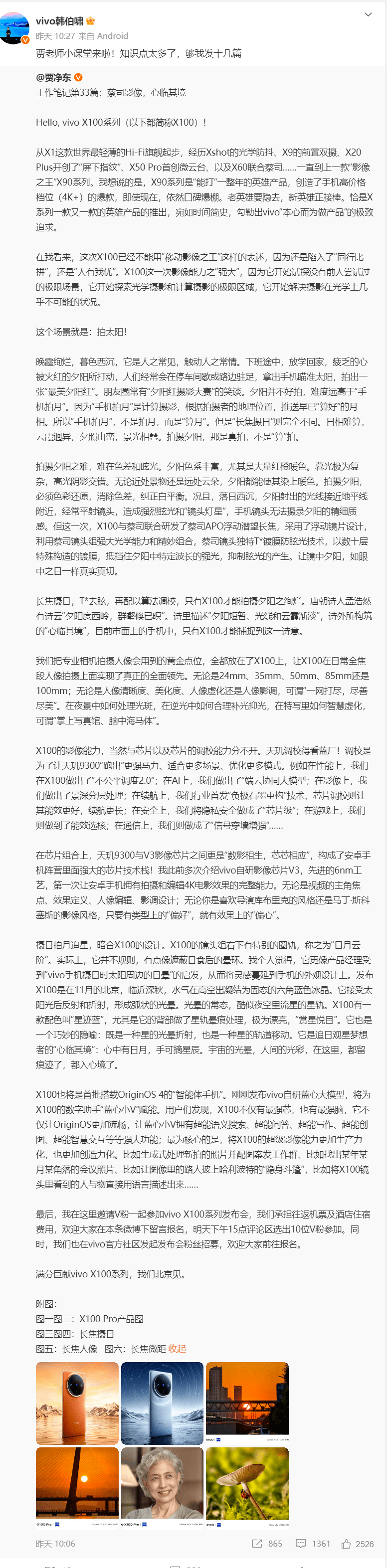根据贾净东透露的信息显示,vivo X100系列影像的强大已经不能用“移动影像之王”来形容了。因为它开始试探没有前人尝试过的极限场景,它开始探索光学摄影和计算摄影的极限区域,它开始解决摄影在光学上几乎不可能的状况。这个场景就是:拍太阳。贾净东表示,夕阳并不好拍,难度远高于“手机拍月”。因为“手机拍月”是计算摄影,根据拍摄者的地理位置,推送早已“算好”的月相。但是“长焦摄日”则完全不同。日相难算,云霞迥异,夕照山峦,景光相叠。拍摄夕阳,那是真拍,不是“算”拍。
