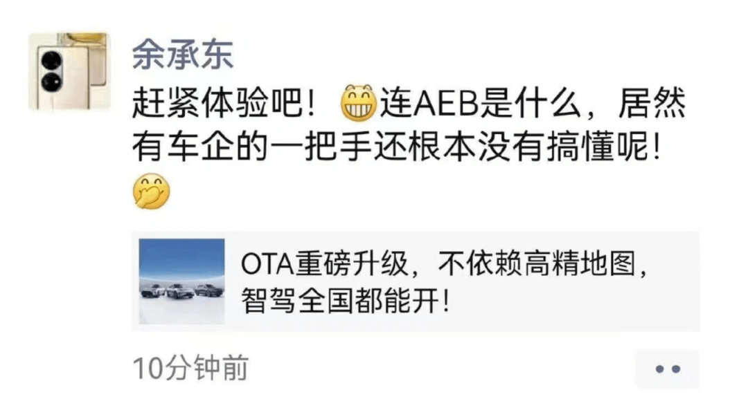 ( IT 之家 )11 月 4 日消息,华为常务董事、终端 BG CEO、智能汽车解决方案 BU 董事长余承东昨夜通过朋友圈发文,矛头直指“ 有的车企 ”,称其连 AEB( 自动紧急制动系统 )是什么都根本没有搞懂。