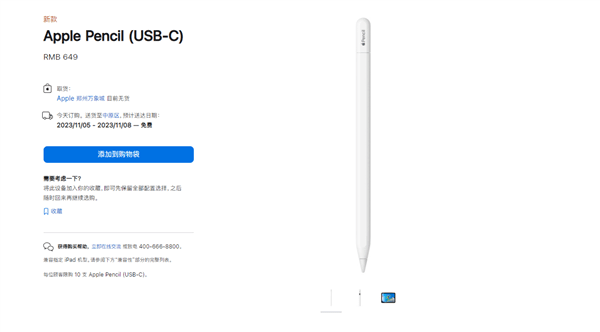 快科技11月2日消息,从苹果官网获悉,10月发布的苹果新款USB-C接口Apple Pencil正式上市开售,售价649元。