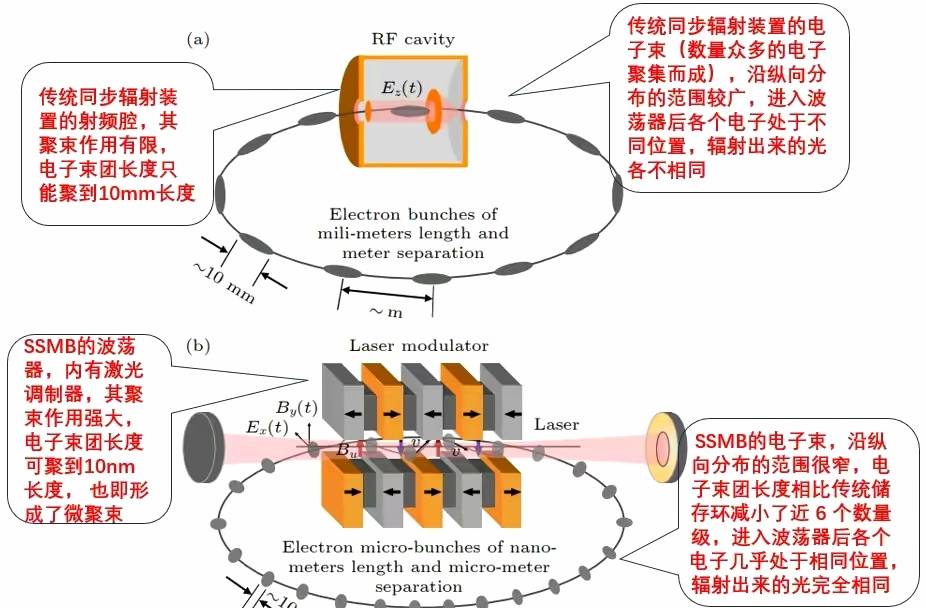 而清华大学研究团队提出的稳态微束(SSMB)技术提供了一种新的思路,它利用激光操控储存环中的电子,形成具有精微纵向/时间结构的电子束团,即微聚束。通过有机结合微聚束辐射的强相干特性以及储存环内电子束的高回旋频率特性,SSMB光源可提供高平均功率、窄带宽的相干辐射,波段可涵盖从太赫兹到极紫外波段。