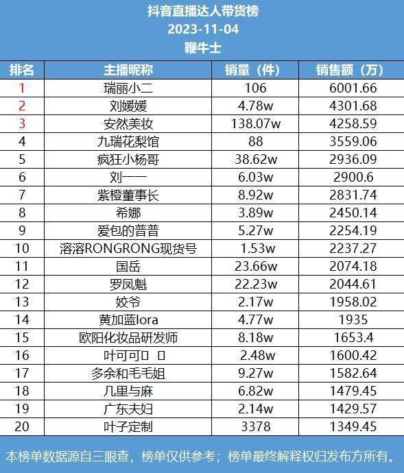 11月4日,抖音直播达人带货榜一是瑞丽小二,销售额6001.66万;榜二刘媛媛,销售额4301.68万;榜三安然美妆,销售额4258.59万。