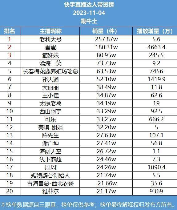 【直播带货日榜】是鞭牛士和三言科技推出的多个平台达人每日直播带货榜单。根据第三方数据平台“三眼查”提供的数据,鞭牛士将对快手、抖音平台的达人带货交易量、GMV、播放量进行统计和分析,以供各位从业者参考。