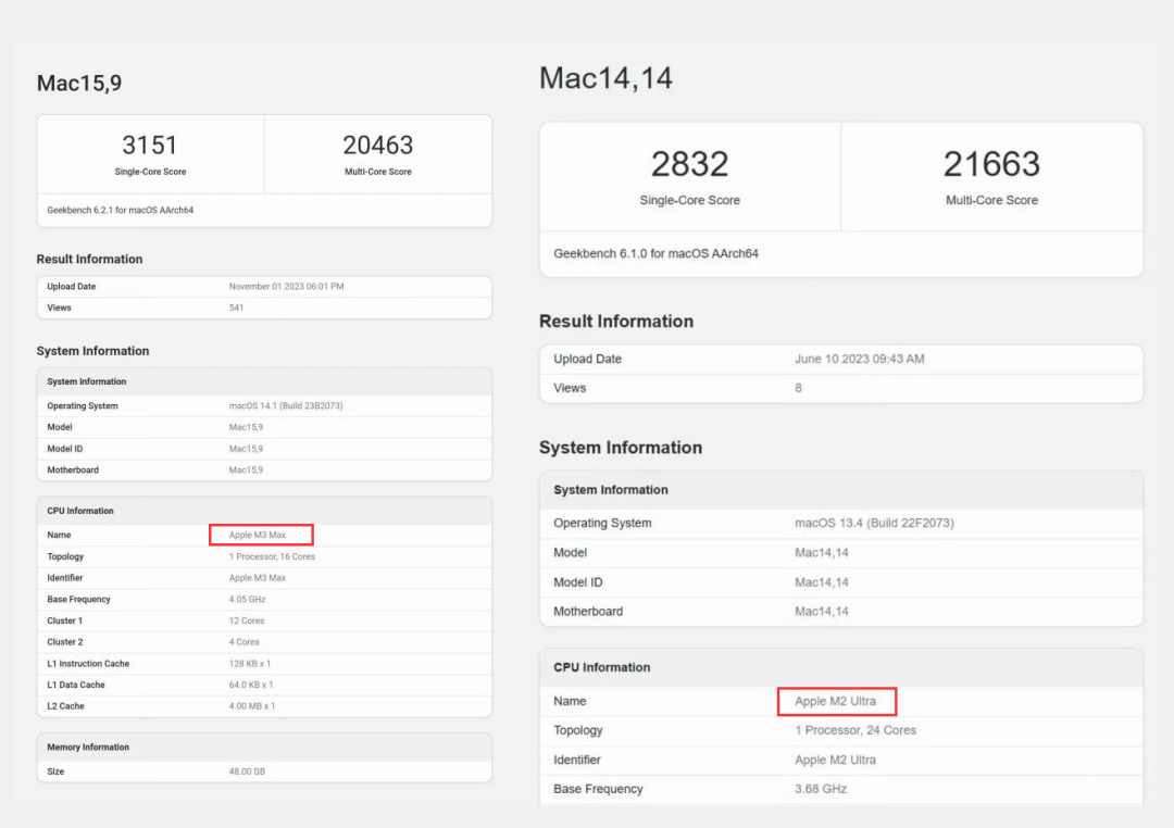 至于M3 Max的单核跑分最高为3151分,多核跑分最高为21084,对比上一代顶配M2 Ultra芯片单核性能依旧领先,多核性能则稍逊一筹。