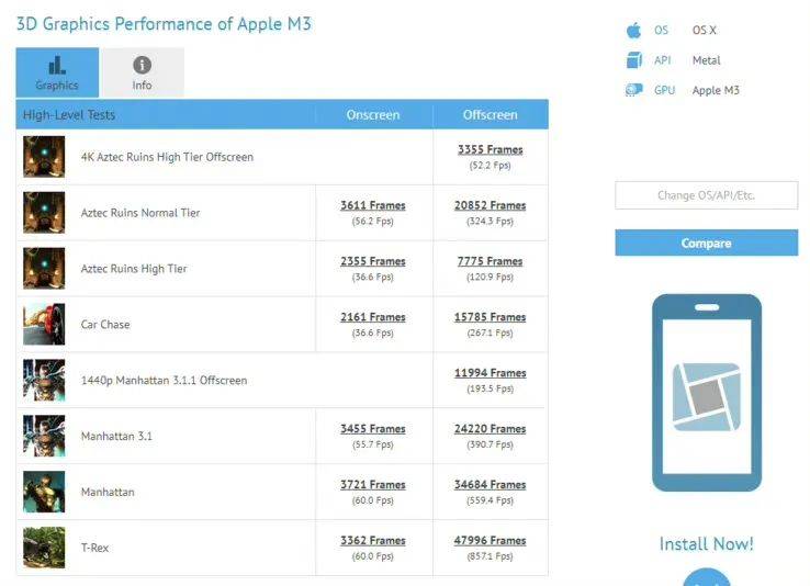 不过据网友@jimmyjamesuk123分享,苹果M3芯片在Azet Ruins(Normal Tier, Offscreen)测试中为324FPS,对比高通最新推出的骁龙X Elite处理器,苹果M3比23W的TDP 版本(294 FPS)高出约10%,比80W的TDP版本(356FPS)低9%。比前代M2芯片(295FPS)也仅高出约9%。