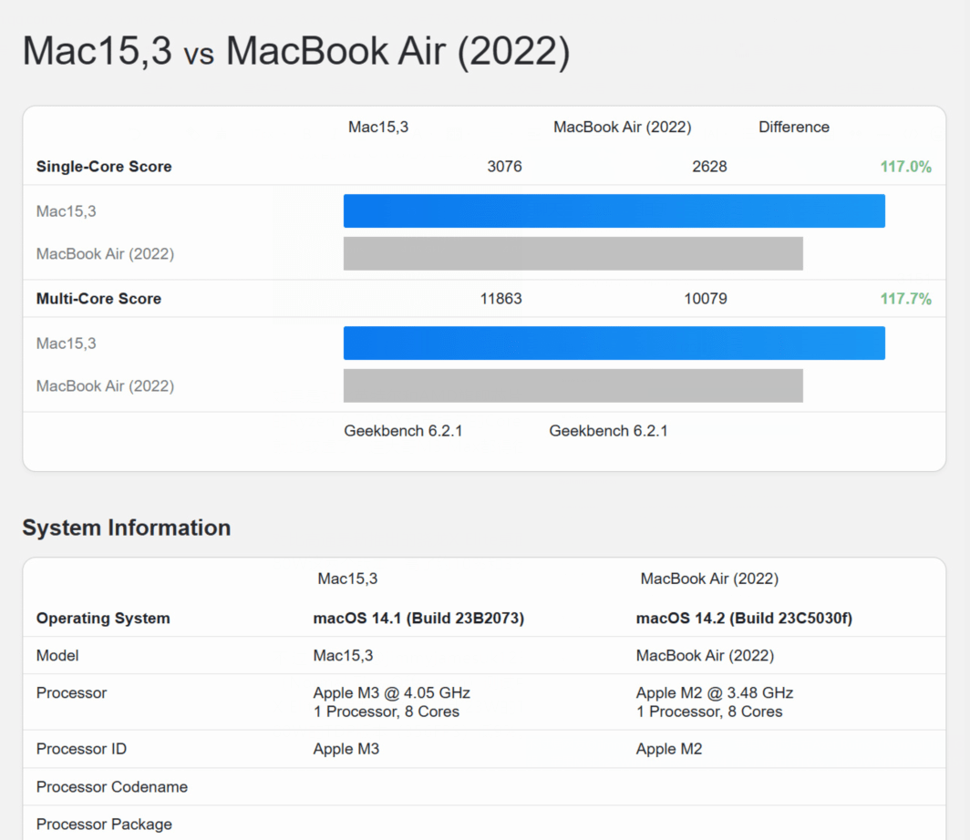 得益于3nm工艺制程的升级以及新增50亿个晶体管,入门级M3芯片的单核跑分为3076分,多核跑分为11863分,对比上一代M2芯片,M3在单核和多核跑分上均领先了17%左右。