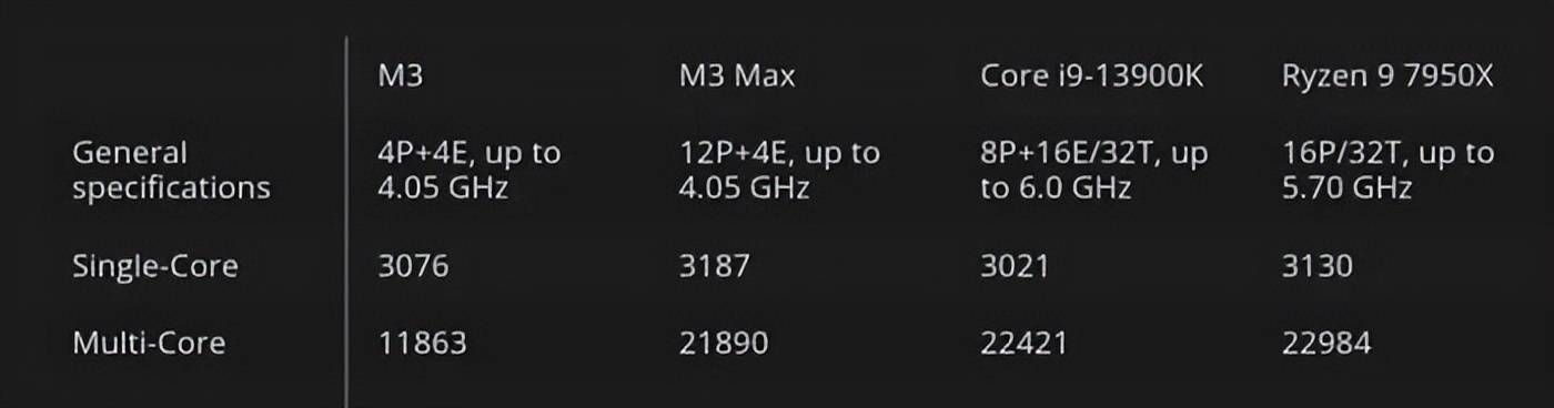 如果是对比英特尔和AMD旗舰芯片,M3芯片在单核性能上也可以和AMD的Ryzen9 7950X和英特尔的Core i9-13900K掰掰手腕,不过多核的话,就比较虚了,连大哥M3 Max都得往后站站。
