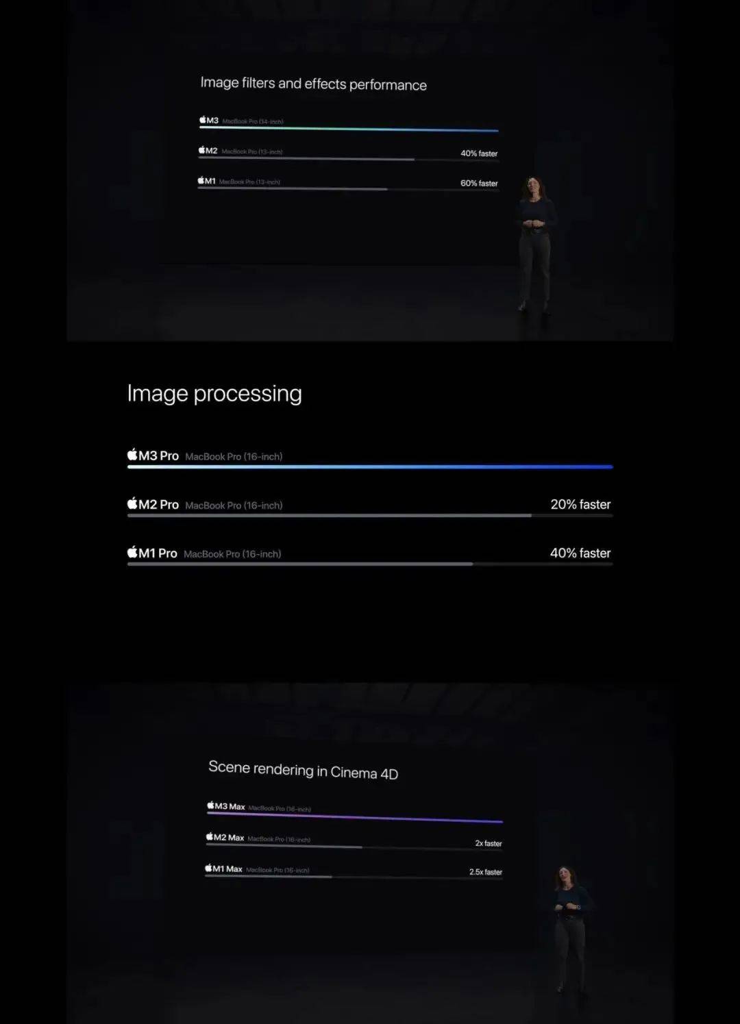 苹果介绍称,搭载M3芯片的MacBook Pro对比M1版最高提速60%;搭载M3 Pro的MacBook Pro对比M1 Pro最高提速40%;搭载M3 Max的MacBook Pro渲染速度对比M1 Max提高了2.5倍,中央处理最高提速80%!