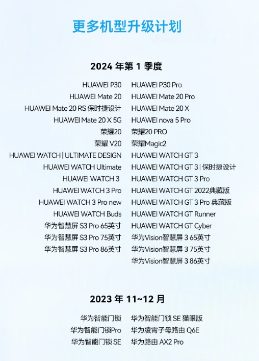 值得注意的是,可升级鸿蒙4的设备不只是手机,还包括手表和智慧屏。例如,华为WATCH GT 3系列、WATCH 3系列、WATCH保时捷设计、WATCH GT Runner和WATCH GT Cyber等热销设备也将在明年第一季度升级。此外,华为智慧屏S3 Pro系列、华为Vision智慧屏3系列等设备也将加入鸿蒙4升级的阵营。