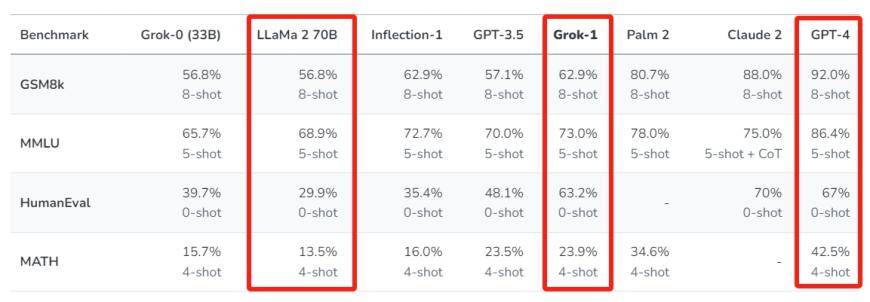 从xAI公布的测试数据来看,Grok-1在多项基准测试中的成绩虽然距离GPT-4、Claude 2尚有一定的距离,但已经能够压过LLaMa 2一头。通过这个数据,业界大概也能理解Grok-1处在一个什么样的位置,以及要训练一个“超越GPT-3.5”大模型所需的时间。