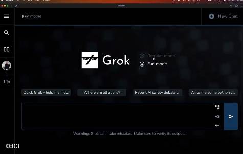 关于宣传中提到的“措辞有反骨”,Pohlen的展示也显示出聊天机器人具有“普通模式”和“有趣模式”。选择“有趣模式”时,会在Grok的图标上闪现一副墨镜。