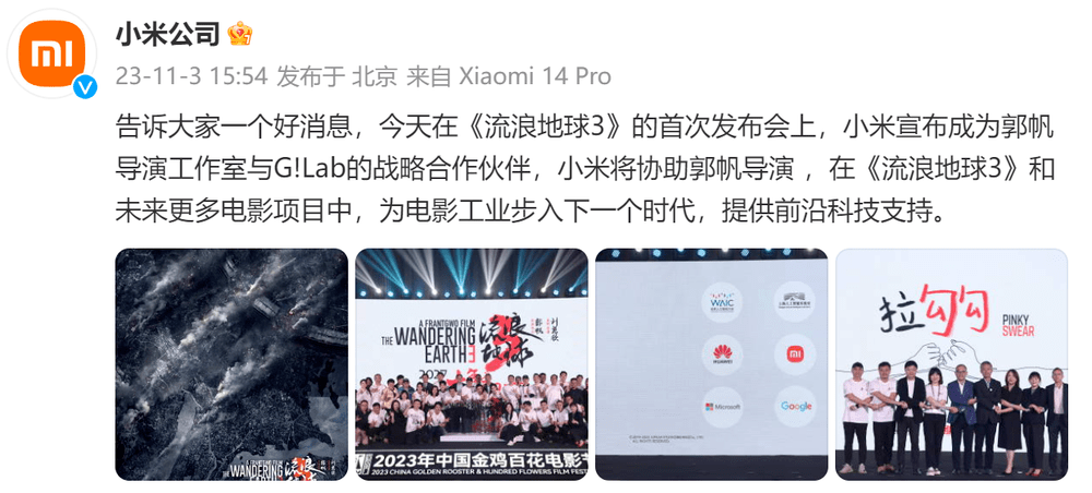 对于此次合作,小米集团表示,他们期待通过战略合作协助郭帆导演 ,在《流浪地球3》和未来更多电影项目中,为电影工业步入下一个时代,提供前沿科技支持。同时,小米也将充分发挥其在科技创新和产品研发方面的优势,为《流浪地球3》以及未来的电影项目提供全方位的技术支持。