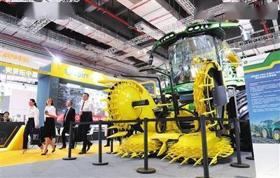 11月5日,参观者在第六届进博会上经过约翰迪尔公司推出的8600机型青贮收割机展品。 新华社记者 方喆 摄