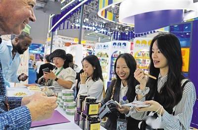 11月5日,在第六届进博会食品及农产品展区,参观者试吃贝宁蜂蜜。